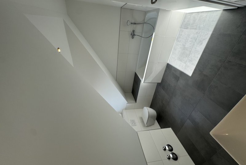Das Tageslicht-Badezimmer ist hochwertig und modern gestaltet. Neben einer großen ebenerdigen Dusche, einer Badewanne, einem Waschbecken und einem WC erwarten Sie edle Armaturen und geschmackvoll ausgewählte Fliesen, die dem Raum eine stilvolle Note verleihen.